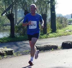 Ik lijk in een aardig ritme te komen. Af en toe Ed langszij voor een aanmoediging. Mijn benen zijn niet zo zwaar als in Mijdrecht. Dan zie ik iemand voor me. Een buitenstaander? Toch niet, het is Robert, hij doet heel rustig. En als we bij 7 langs Willem lopen, die genoodzaakt is zijn krachten te sparen voor de zeven heuvelen morgen, kom ik dichterbij. En vlak na Marjolein haak ik aan. Dat is maar voor een paar honderd meer want Robert is weer op krachten en gaat er van door. Ik besluit geen poging te doen me aan hem op te trekken. Maar toch vind ik het fijn als hij even later weer iets terugzakt, het doet mijn tempo goed.